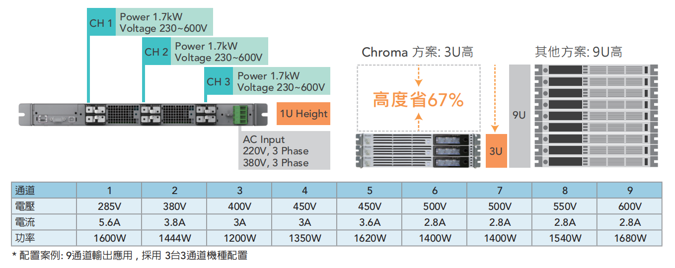 采用高功率密度之电源设计实现1U机框内可3信道1.7kW输出,各别通道具隔离设计可独立电压/电流控制及测量,此可节省系统整合柜体之空间配置及简化配线,举例应用:以下原为系统整合制造商于设备上所需的9台直流电源供应器规格,相较于其它方案须9台单通道电源,配置高度9U;使用62000E系列电源进行规划仅需3台,高度总和3U即可符合(规划使用3信道机种)。