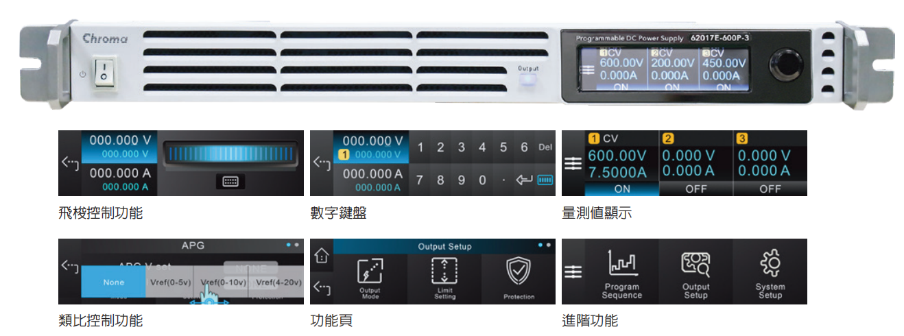Chroma 62000E系列可程控直流电源供应器提供1U机框内含单通道1.7kW、3.4kW、5kW及三信道1.7kW,为采用高功率密度之电源设计,具有固定范围(Fixed-range Output)电源及宽范围(Auto-range Output)电源两款共28个不同的机型,输出电流范围可达22.5A,电压范围至1200V。